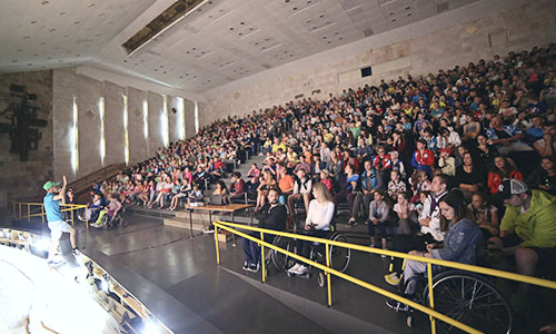 Зал подходит для торжественных мероприятий, презентаций и выступлений. 520 стационарных мягких кресел, расположенных ярусами «кинотеатр», сцена и кулисы. Оснащение: проектор, световое и звуковое оборудование.